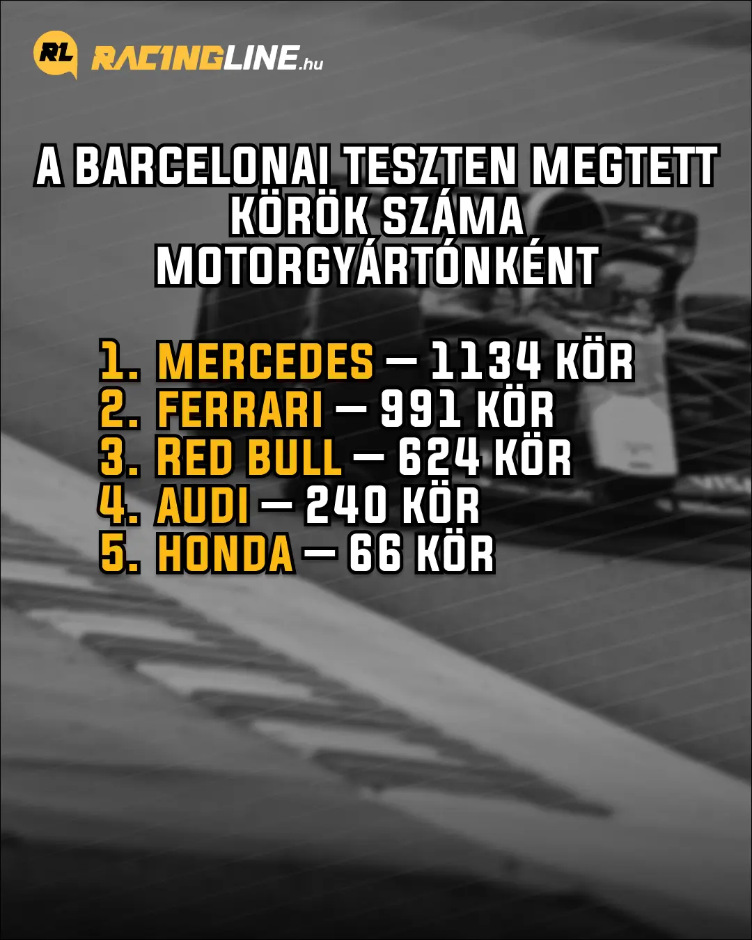 A minap véget ért a 2026-os Forma–1-es szezon első tesztje (tudjuk, tudjuk, hivatalosan bejáratás), amelyet zárt kapuk mögött, a lehető legnagyobb titoktartás mellett rendeztek meg Barcelonában, így a szokottnál sokkal kevesebb információ áll a rendelkezésünkre bármiféle elemzéshez. Az összes köridő és az éppen használt gumikeverékek, valamint az erősorrend nagyjából történő megsaccolásához elengedhetetlen felvételek (olyanok, amelyek eltérő körülmények között, huzamos ideig mutatják az autókat, miközben az ember tudja, hogy éppen versenyt vagy rövidebb etapokat szimulálnak) nélkül is le lehet azonban vonni néhány következtetést az elmúlt öt napból (amelyből egy csapat legfeljebb hármon léphetett pályára).