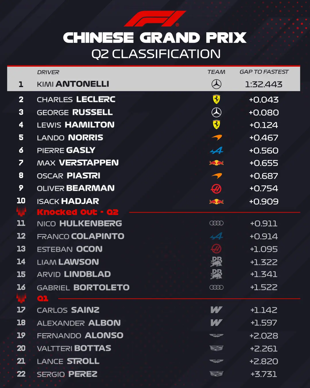 Végül a négyszeres világbajnok a 4., Hadjar a 9. helyen jutott tovább, miközben úgy tűnt, legalább az egyik Williamsnek meglehet a Q2, ám végül Sainz is visszacsúszott a kiesők közé, így Sainz, Albon, Alonso, Bottas, Stroll, Pérez lett a sorrend a mezőny végén.