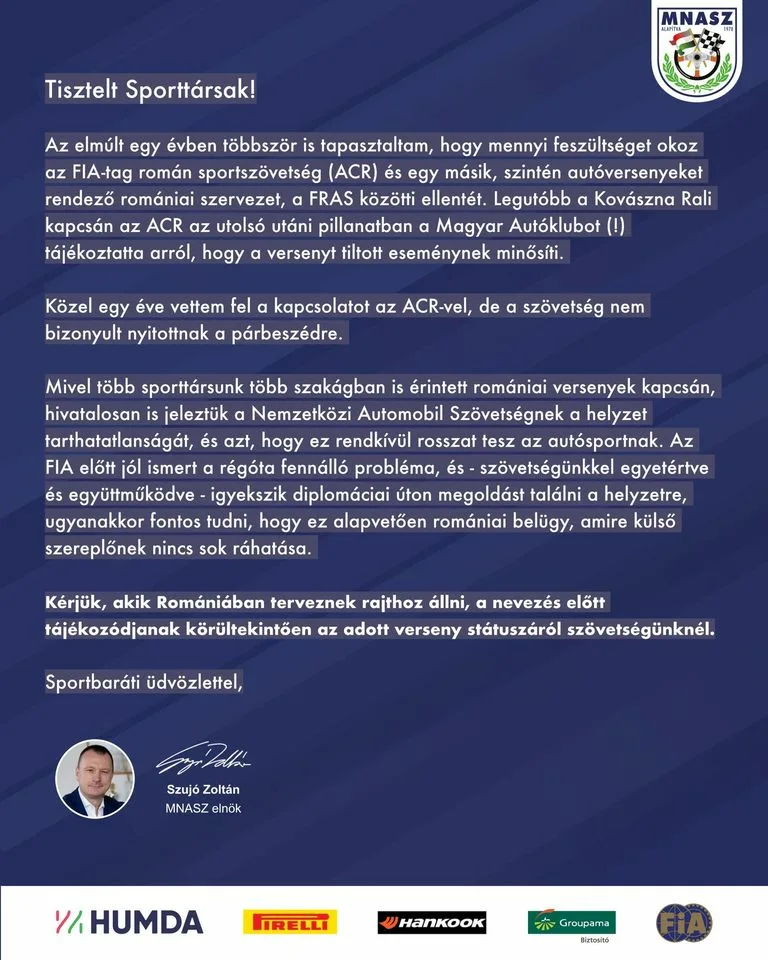 Szujó Zoltán az MNASZ elnöke közleményben tisztázta a Kovászna Rally kapcsán újra felszínre került tiltott romániai versenyek kérdéskörét.