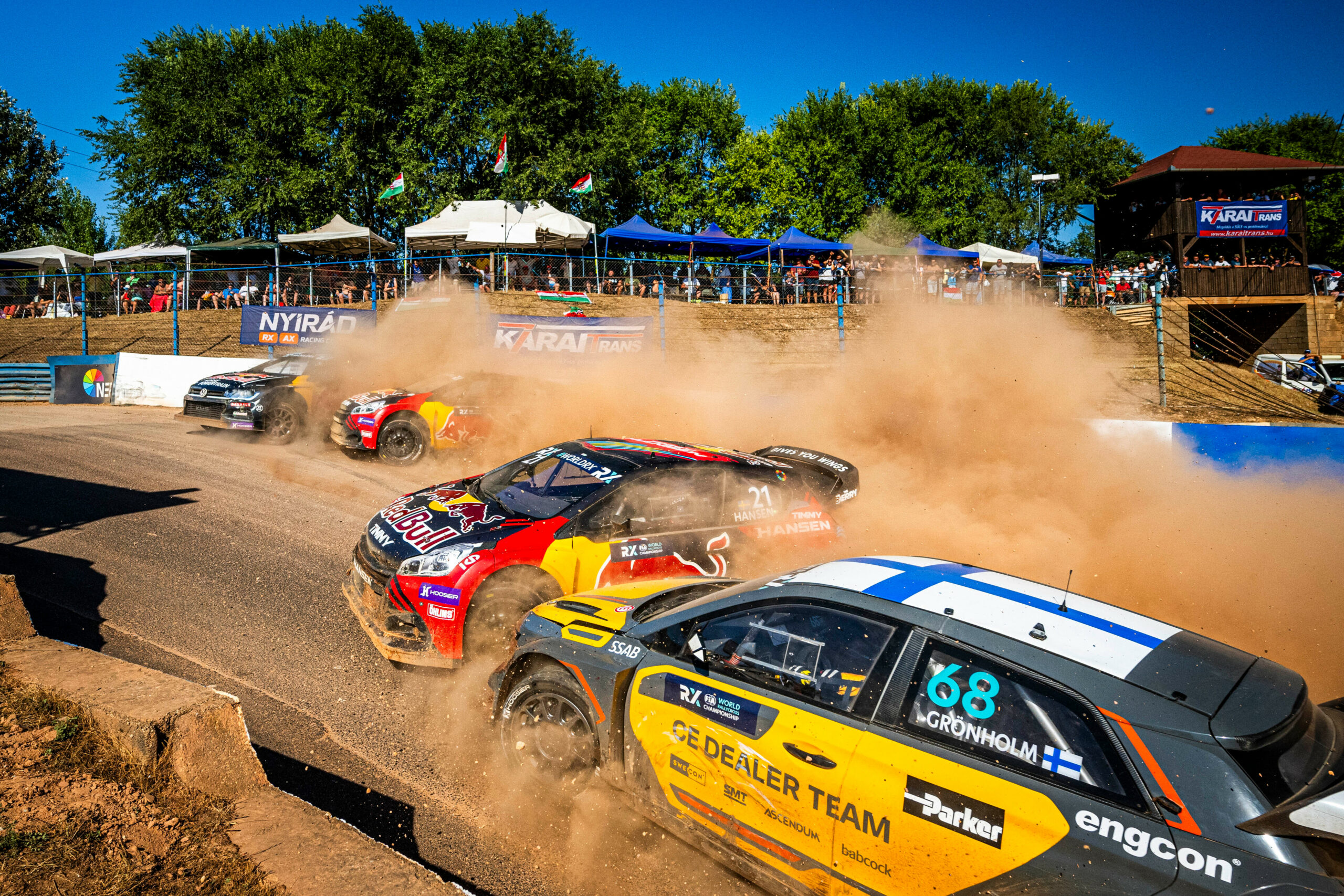 A CE Dealer Team versenyzője Niclas Grönholm nyerte a Nyirádon megrendezett első döntőt, miután az első sorból rajtoló miután Johan Kristoffersson és Kevin Hansen összecsapott az első kanyarban. Hansen beletolta Kristofferssont a falba és ő is a gumiknak ütközött, majd a második kanyarban Veiby megforgatta Timmy Hansent. Grönholm kimenekült és az élre ált, Veiby ment mögötte a kissé sérült Volkswagennel, Wieszt pedig a csatákból kimaradva lett harmadik.