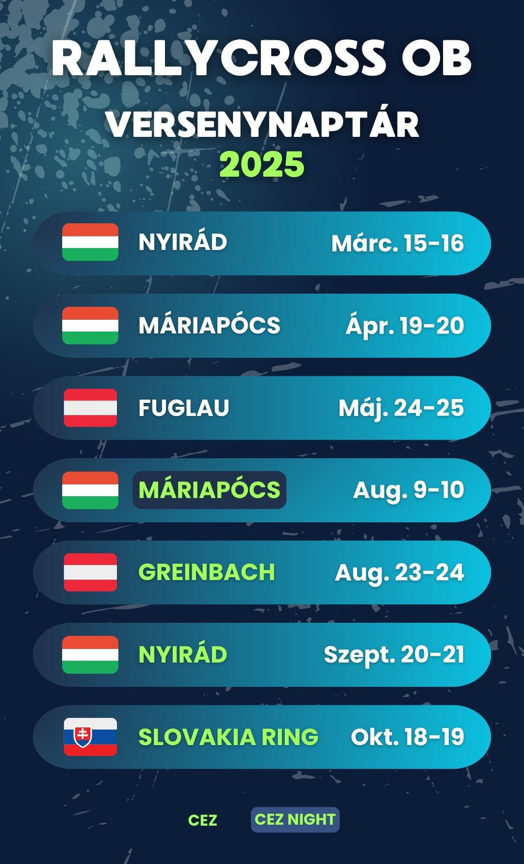 A hazai bajnokság május végén Fuglauban folytatódik, aztán a nyári szünetet követően Máriapócs egy különleges versennyel várja az indulókat: a kivilágított Rabócsiringen éjszakai futamokat rendeznek.