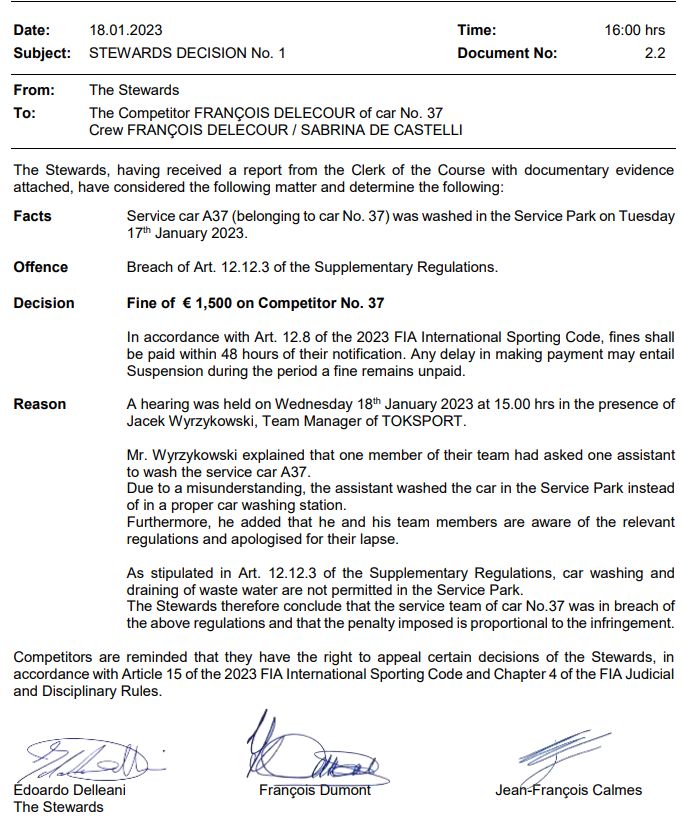 Szerda délután a stewardok meghallgatását tartották a Toksport csapatmenedzserével, Jacek Wyrzykowskival, aki elmondta, hogy a csapat egyik tagját felkérték a Delecourhoz tartozó A37-es szervizautó mosására, de egy félreértés miatt lemosták a szervizparkban mosták le az autót nem a környék egyik autómosójában.