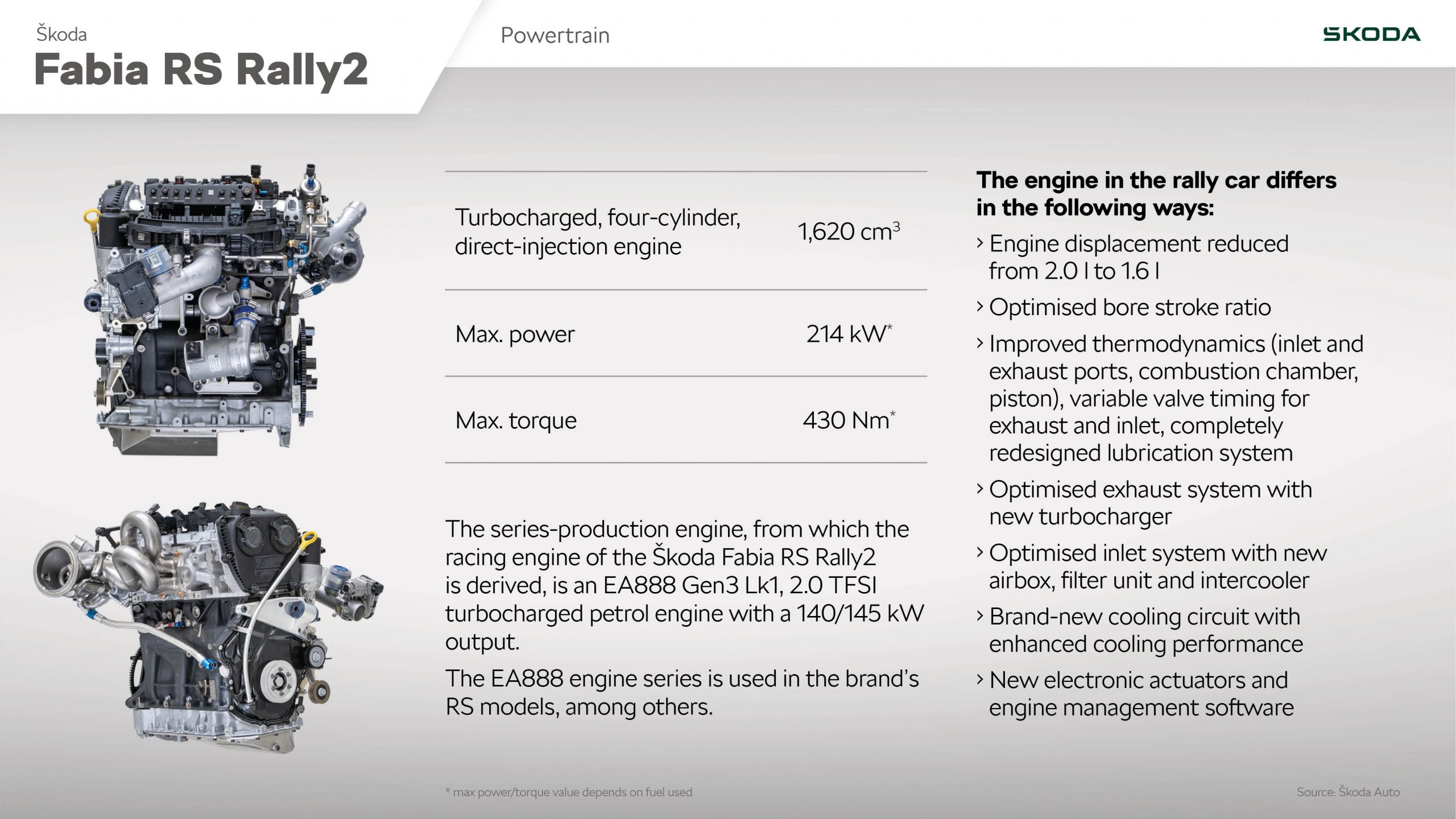 Az új motor a jól ismert EA888 kódú motorcsalád 2.0 TSI motorján alapul, amelyet többek között az Octaviában és a Kodiaq RS-ben használnak. A Rally2-ben kötelező széria alapokra épített motort használni, ezek maximum 1620 köbcentiméteres négyhengeres erőforrások lehetnek és a 32 milliméteres szűkítő is előírás.